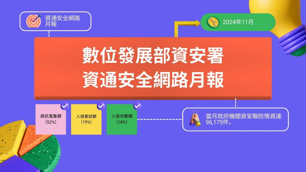 政府機關資安威脅持續攀升,數位發展部資安署最新公布的11月資安月報顯示,當月政府機關資安聯防情資達96,175件,不僅較前月增加5,417件,更創下2022年9月以來的兩年新高。其中,資訊蒐集類威脅占比最高,達52%。