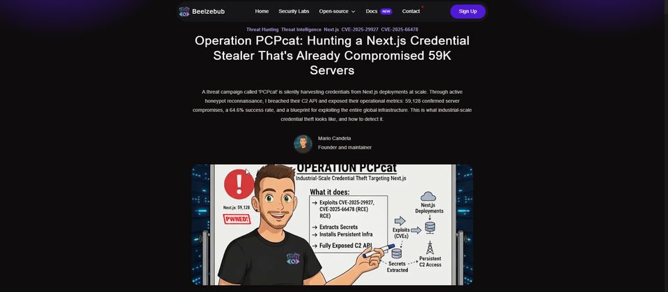 AI蜜罐陷阱平臺Beelzebub揭露名為Operation PCPcat的攻擊活動,駭客針對Next.js應用程式下手,試圖透過React2Shell入侵,並進行大規模憑證收集,經確認兩天內已針對91,505臺進行探測,有59,128臺伺服器受害,漏洞利用活動的成功比例高達64.6%。以每臺伺服器被偷走5至10個憑證來估算,恐有30萬至59萬組憑證外洩。