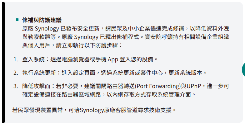 資安院在2月9日發布群暉NAS裝置裝置資安警示,同時公布修補與防護建議。(圖片擷取自資院院)