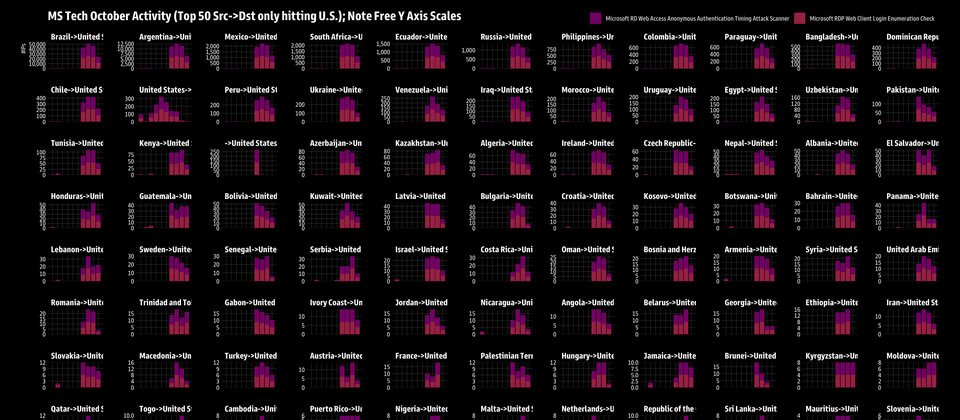 資安業者GreyNoise揭露從10月8日出現的殭屍網路攻擊行動,駭客的目標是位於美國的遠端桌面連線(RDP)服務,他們利用超過10萬個IP位址發動攻擊,這些來源網址來自巴西、阿根廷、伊朗、中國、墨西哥等超過100個國家及地區。攻擊型態主要有兩種,一種是透過遠端桌面的網頁存取服務當中,存在匿名身分驗證計時的弱點來進行;另一種為RDP網頁用戶端的登入列舉攻擊手法。