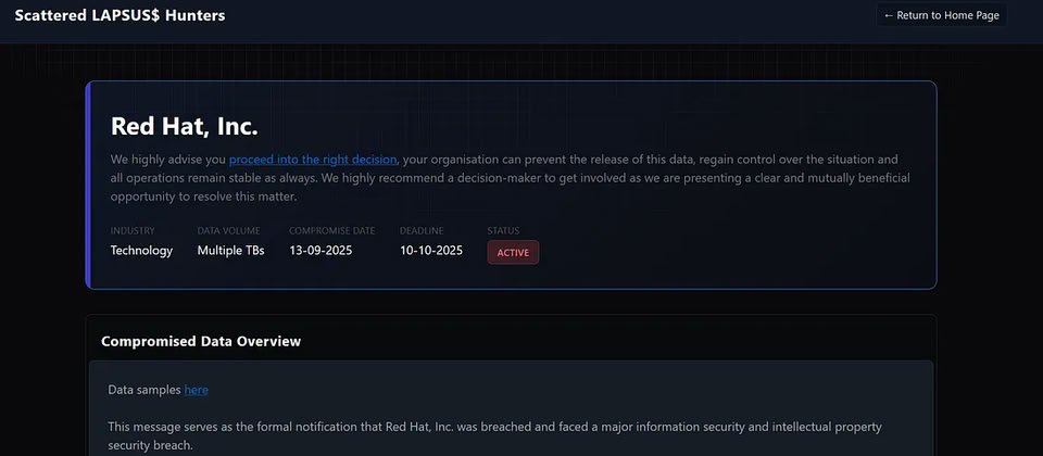 另一項資訊來自Scattered Lapsus$ Hunters於網站上公布的內容,他們聲稱在9月13日入侵Red Hat,並公布竊得資料的檔案結構,總共有370,852個資料夾、3,438,976個檔案。Kevin Beaumont提及此網站具備Lapsus$的特徵,包含Lapsus$會拼寫錯誤的字,以及隨意在HTML註解寫入種族主義言論等。